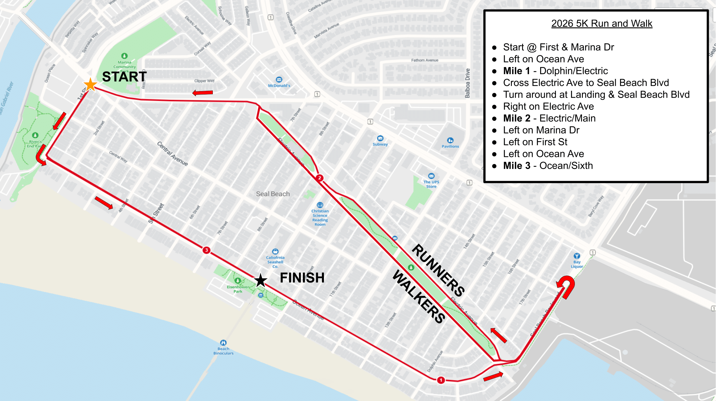 * The Race Starting Line is at the Seal Beach Community Center, 151 Marina Drive, Seal Beach, CA 90740. (View Map)